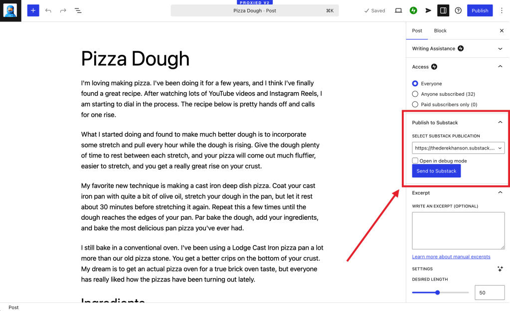Write your post in WordPress, select your Substack publication, and click “Send to Substack.” The browser extension will open a new tab and magically paste all of your blog post content into a new Substack post. That’s it!
