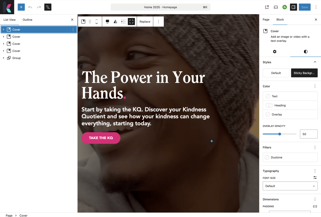 That kind of scroll-driven narrative (sometimes called “scrollytelling”) usually means custom JavaScript, a page builder, or handing the whole thing off to a front-end developer. We didn’t want any of that. We wanted the editorial team at Kindness.org to build and update this experience themselves, using blocks they already know.