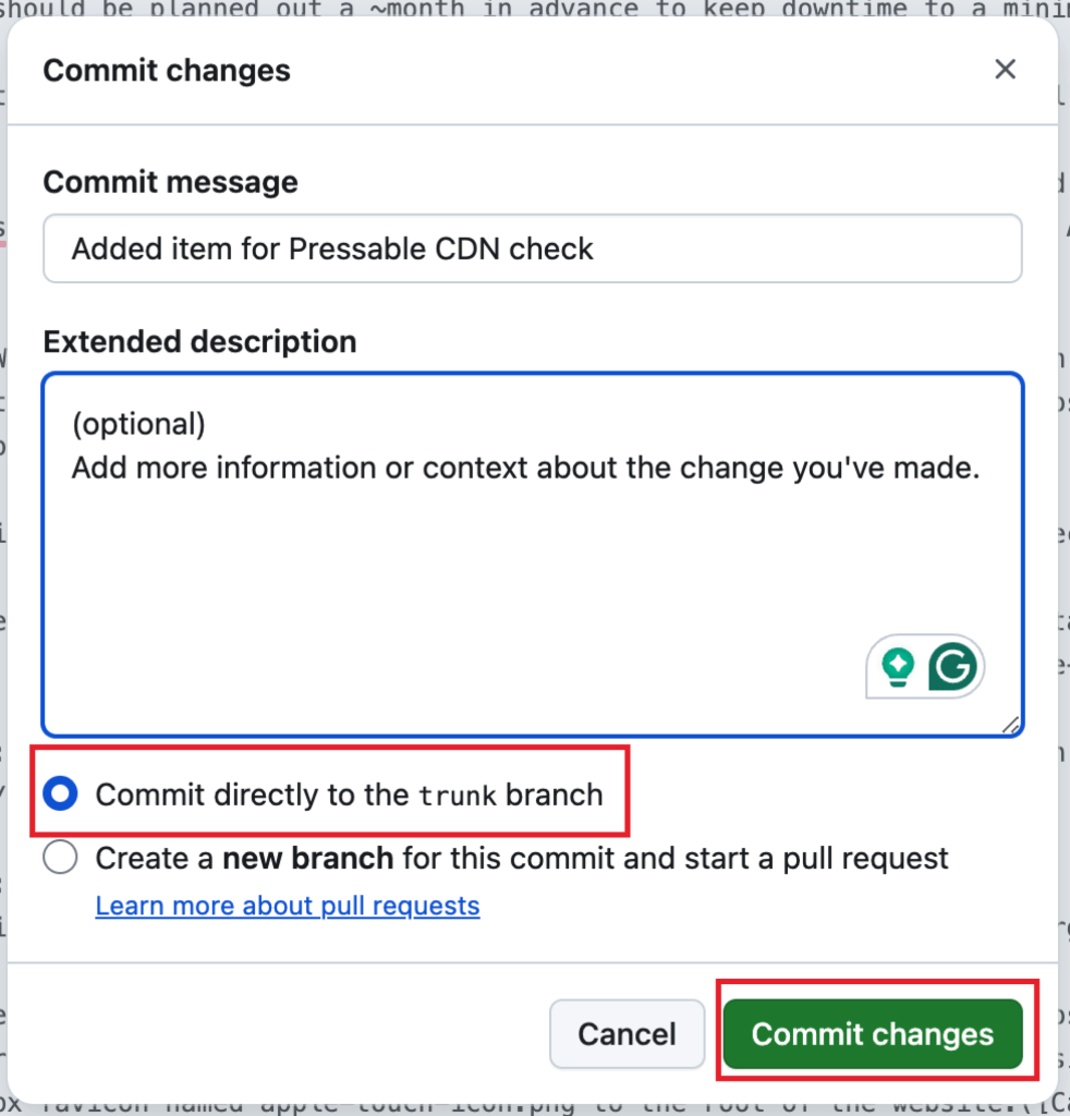 To edit the checklist, you will need to edit the Markdown files in GitHub. For the checklists it’s OK to edit directly in the browser and commit to the trunk branch. See the steps below: