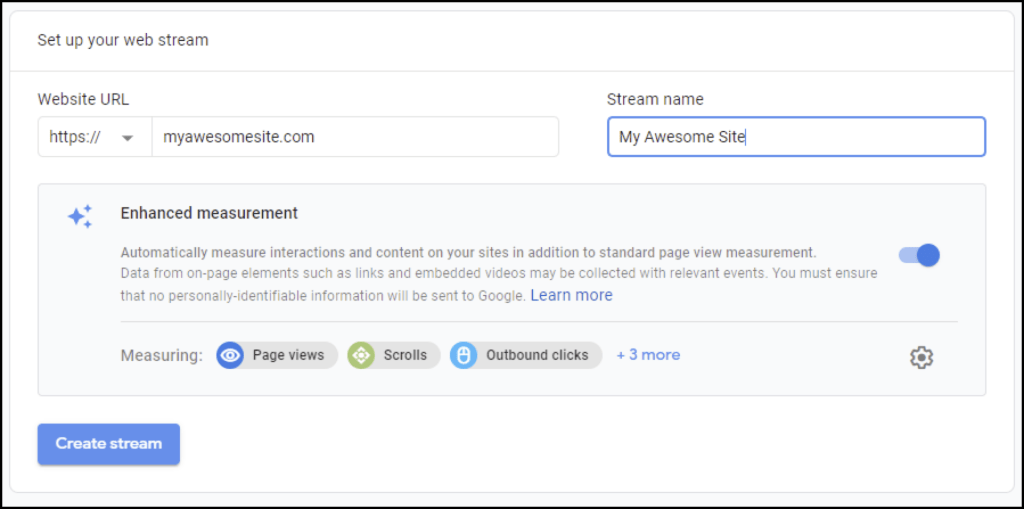 - You will then be presented with this screen asking you to choose a property. Choose Web and insert your website’s domain. Select https:// and enter the website name in the Stream Name box and click Create Stream.