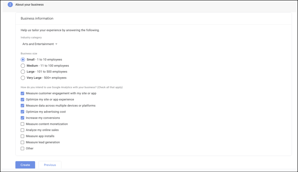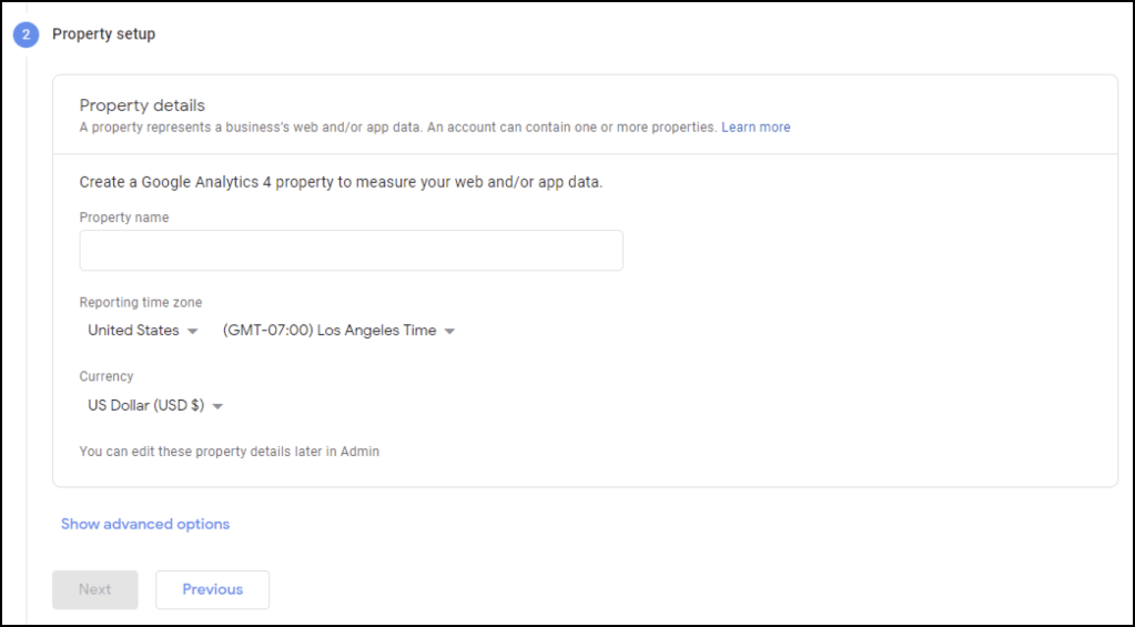 + Create Propertybutton to create a new analytics profile. You will then be taken to the Property Setup screen. - On the Property Setup screen, fill in the following details: